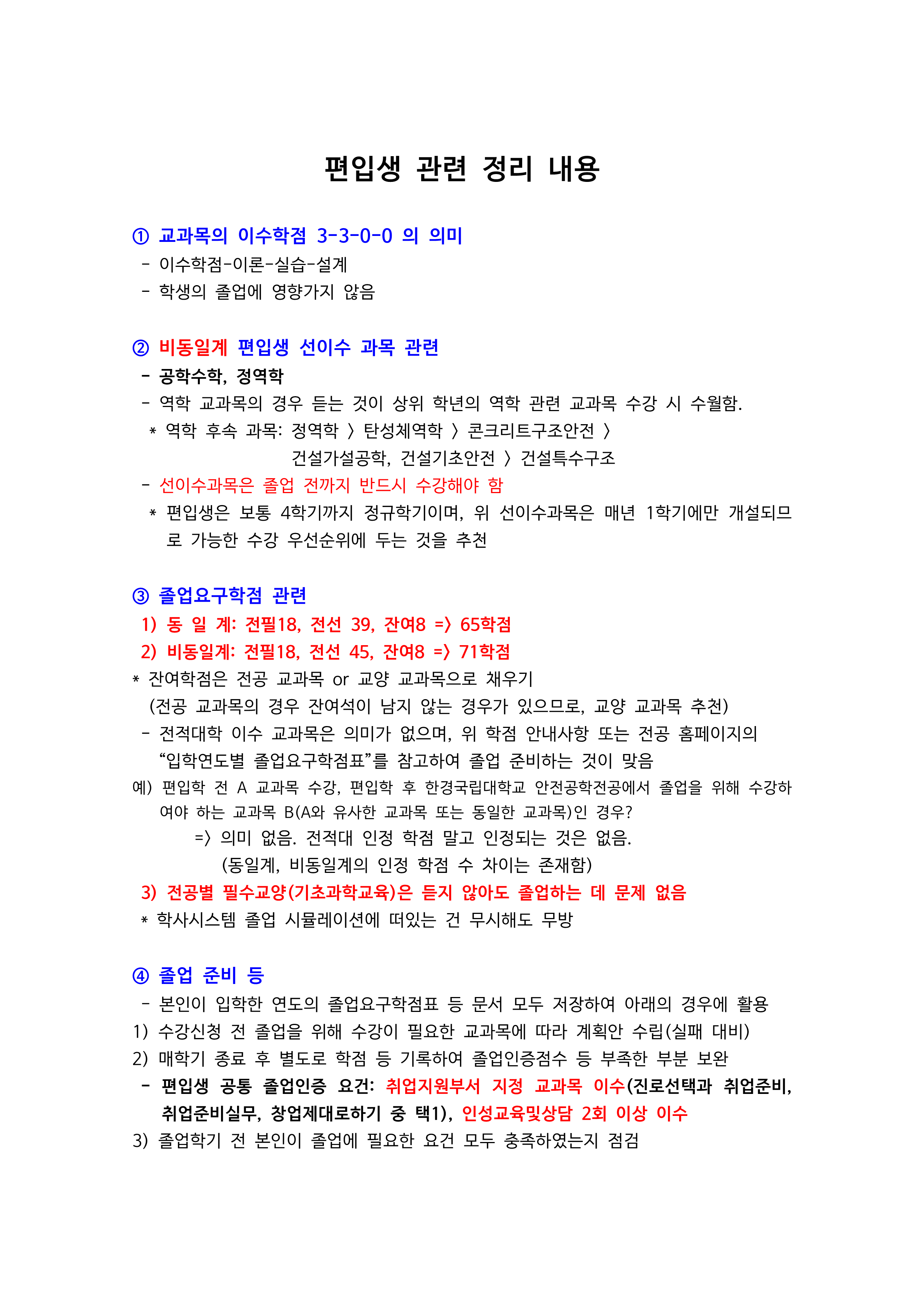 편입생 졸업 관련 정보