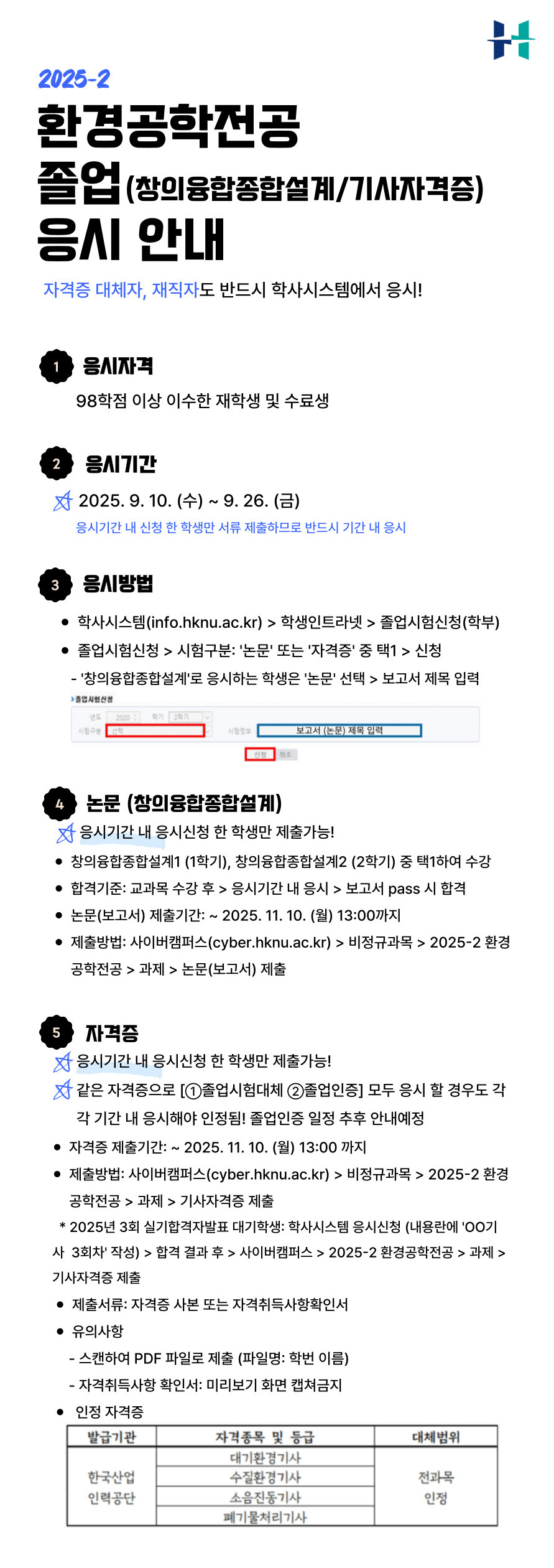 [환경] 2025-2 졸업종합시험(창의융합종합설계/기사자격증) 신청 안내